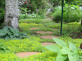 As a result of all this decomposition, the level of the medium will drop. However, by then, the sprigs will have gained traction and will grow upwards--if the Angelina sedum runs true to form, this sedum will grow above the level of the pavers, leaving the pavers as islands in a sea of sedum. The look is charming, and quite suitable to a secondary path such as this one, although the charm would turn to annoyance if the path were a main one and one had to lift one's feet high with every step to avoid crushing the sedum.